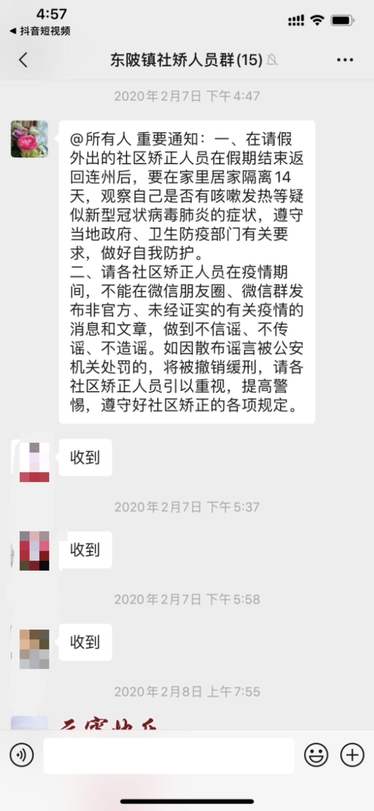 在疫情期間,全市12個(gè)鎮(zhèn)鄉(xiāng)司法所通過社區(qū)矯正微信群,電話抽查、電子定位等信息化手段,要求社區(qū)矯正人員需每日在微信群匯報(bào)其身體狀況及其定位,及時(shí)掌握轄區(qū)內(nèi)的社區(qū)矯正人員活動(dòng)情況,身體情況,嚴(yán)防其不請(qǐng)假外出和脫管。