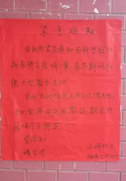 △上洞村延期舉行文化室落成慶典的緊急通知