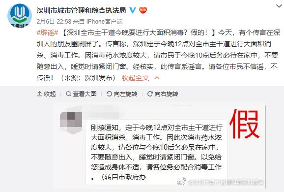 2月6日,網(wǎng)上有人傳言“深圳將于今晚12點進(jìn)行大面積消殺、消毒工作”,并提醒市民晚上10點后“務(wù)必待在家中,不要隨意出入,睡覺緊閉門窗”。消息迅速在微信群中散播,不少深圳市民感到擔(dān)憂。