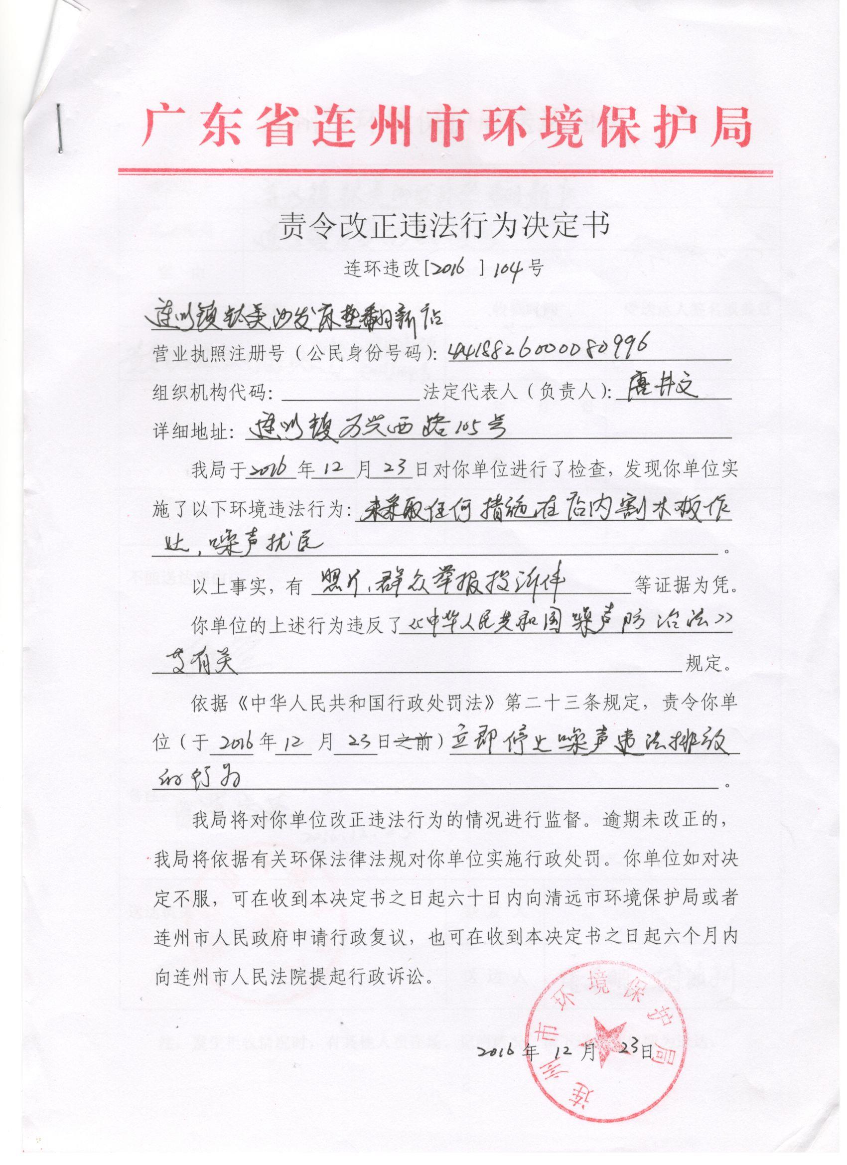 連環(huán)違改字[2016]104號(hào)