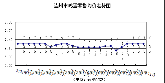 蛋類雞蛋平均零售價格為7.25元/500克,環(huán)比不變。鴨蛋平均零售價格為8.63元/500克,環(huán)比不變。