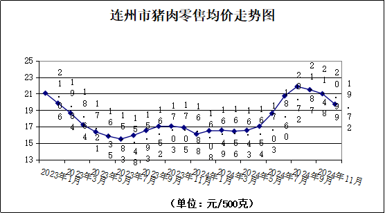 12月份,我市豬肉零售價(jià)格持續(xù)下降。農(nóng)貿(mào)市場(chǎng)監(jiān)測(cè)的四種主要豬肉零售均價(jià)19.72/500克,環(huán)比降6.05%。其中,排骨26.24/500克,環(huán)比降10.26%;精瘦肉21.21/500克,環(huán)比降3.50%;肋條肉15.71/500克,環(huán)比降4.09%,有皮上肉15.71/500克,環(huán)比降4.09%。