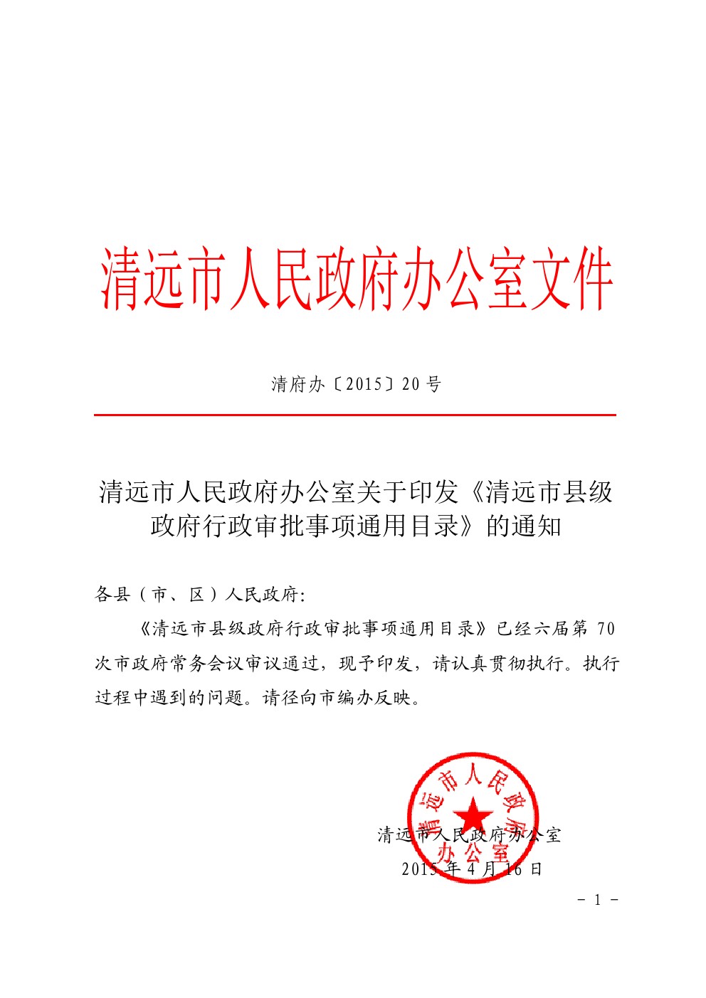 清遠(yuǎn)市人民政府辦公室關(guān)于印發(fā)《清遠(yuǎn)市縣級政府行政審批事項通用目錄》的通知(清府辦[2015]20號)
