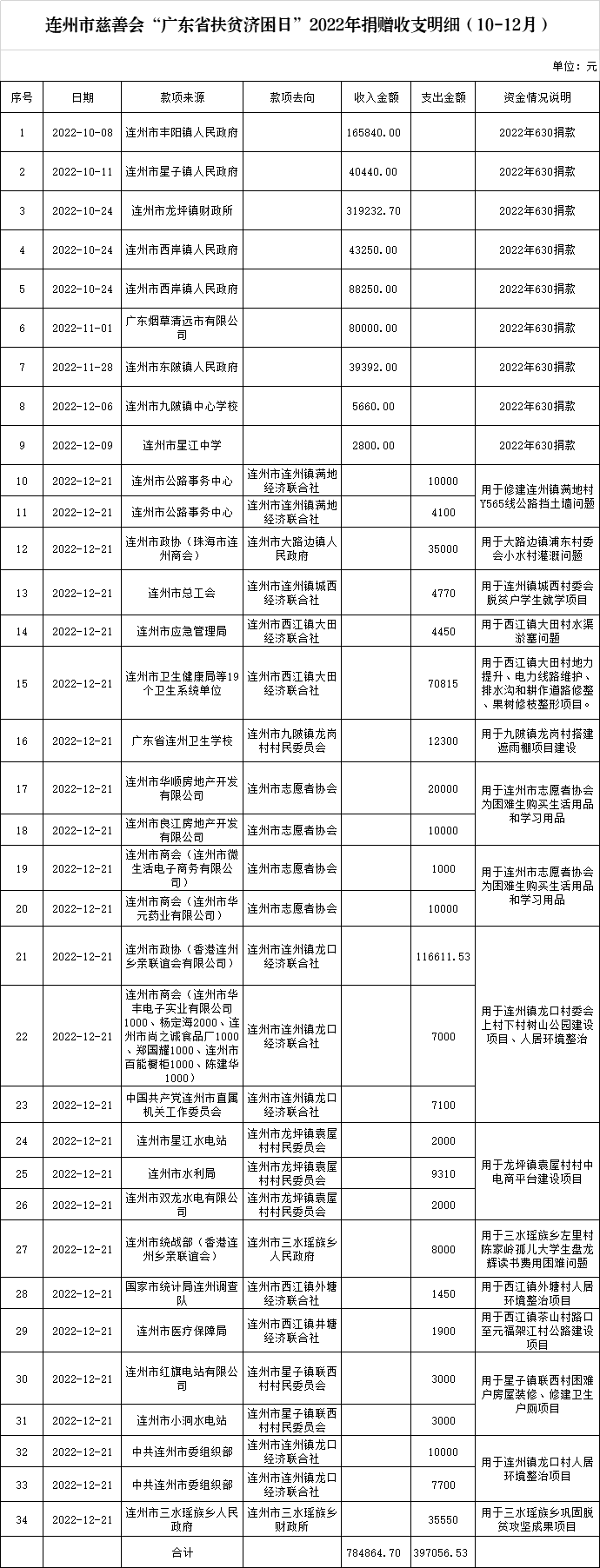 2022年連州市慈善會“廣東扶貧濟(jì)困日”6·30捐款第四季度收到捐贈收入共784864.7元,支出為397056.53元;