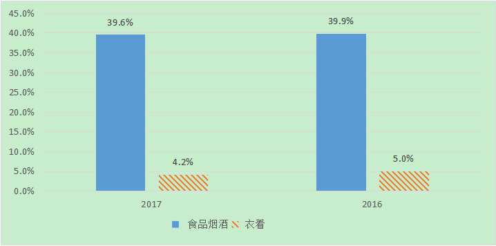 圖1:2016-2017年連州農村居民食品煙酒和衣著消費支出占比