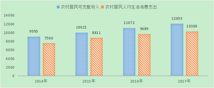 (一)持續(xù)穩(wěn)定的收入增長有利于消費水平的提高。居民收入是影響消費的最主要因素,居民的收入高,隨之消費水平也高,反之,收入下降,消費水平也隨之下降,兩者之間呈現(xiàn)正相關的關系。從圖3可以看出,連州農民人均可支配收入從2014年的9095元增加到2017年的12092.9元,增長33%,年均增長9.4%,消費支出也隨之從2014年的7560元增加到2017年的10300元,增長36.2%,年均增長8%,連州農村居民收入和消費支出呈現(xiàn)同步大幅增加的趨勢,可見,釋放消費潛力必須要讓農民的錢袋子鼓起來。