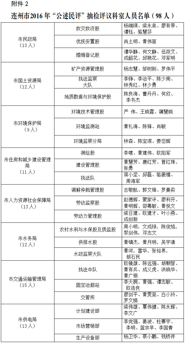 2.連州市2016年“公述民評”抽檢評議科室人員名單