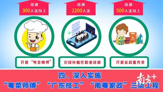 四、深入實(shí)施“粵菜師傅”“廣東技工”“南粵家政”三項(xiàng)工程。開展“粵菜師傅”培訓(xùn)300人次以上。完成補(bǔ)貼性職業(yè)技能培訓(xùn)2200人次。開展家政服務(wù)類培訓(xùn)500人次以上。(主管部門:市人力資源社會(huì)保障局)