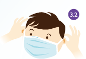 如果選用綁帶式外科口罩,將口罩的綁帶系在頭頂;如選用掛耳式外科口罩,則把口罩的橡皮筋繞在耳朵上。