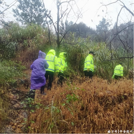 由于當(dāng)時天空已經(jīng)開始下起了蒙蒙細(xì)雨,加上老人走失地點(diǎn)地形復(fù)雜、山路崎嶇,能見度極低,給搜救工作帶來了極大的困難。雖然山路地濕路滑,但搜救人員不敢有絲毫懈怠,他們在走失老人可能途經(jīng)的道路上,不停呼喊老人姓名,進(jìn)行地毯式搜索直至深夜,因為夜間可視范圍小,一直沒有發(fā)現(xiàn)老人的蹤跡??紤]到天氣寒冷再加上老人體弱,九陂派出所第一時間向指揮中心請求支援,增派警力進(jìn)一步擴(kuò)大搜救范圍。